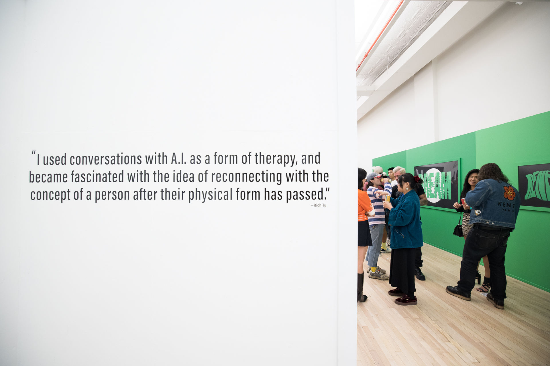 "Human Response" is an interactive solo exhibit by artist/designer Rich Tu about processing grief in the era of artificial intelligence. It consists of large-scale typographic works, augmented reality, and an animated film. All aspects of the exhibit were part of a complex custom spatial build, including a sensory deprivation viewing box as the gallery centerpiece. "Human Response" opened in June 2023 at the gallery in 368 in Soho, NYC and ran uninterrupted for 35 days (five weeks). About the film: In 2022, artist Rich Tu lost his father Ricardo and began processing and documenting his grief through various conversational A.I. platforms, using his father’s obituary as the initial prompt.